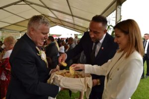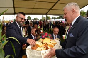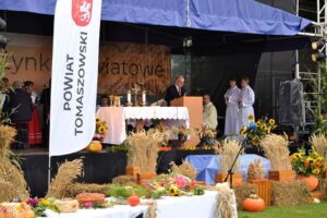 Po zakończenie przejścia korowodu Starostowie tegorocznych dożynek przekazali na ręce Starosty Tomaszowskiego Pana Henryka Karwana kwiaty i chleb z tegorocznych zbiorów. Po czym nastąpiło uroczyste odśpiewanie hymnu państwowego.